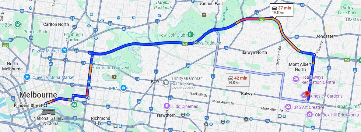 The map below shows driving directions from Flinders Street Station.